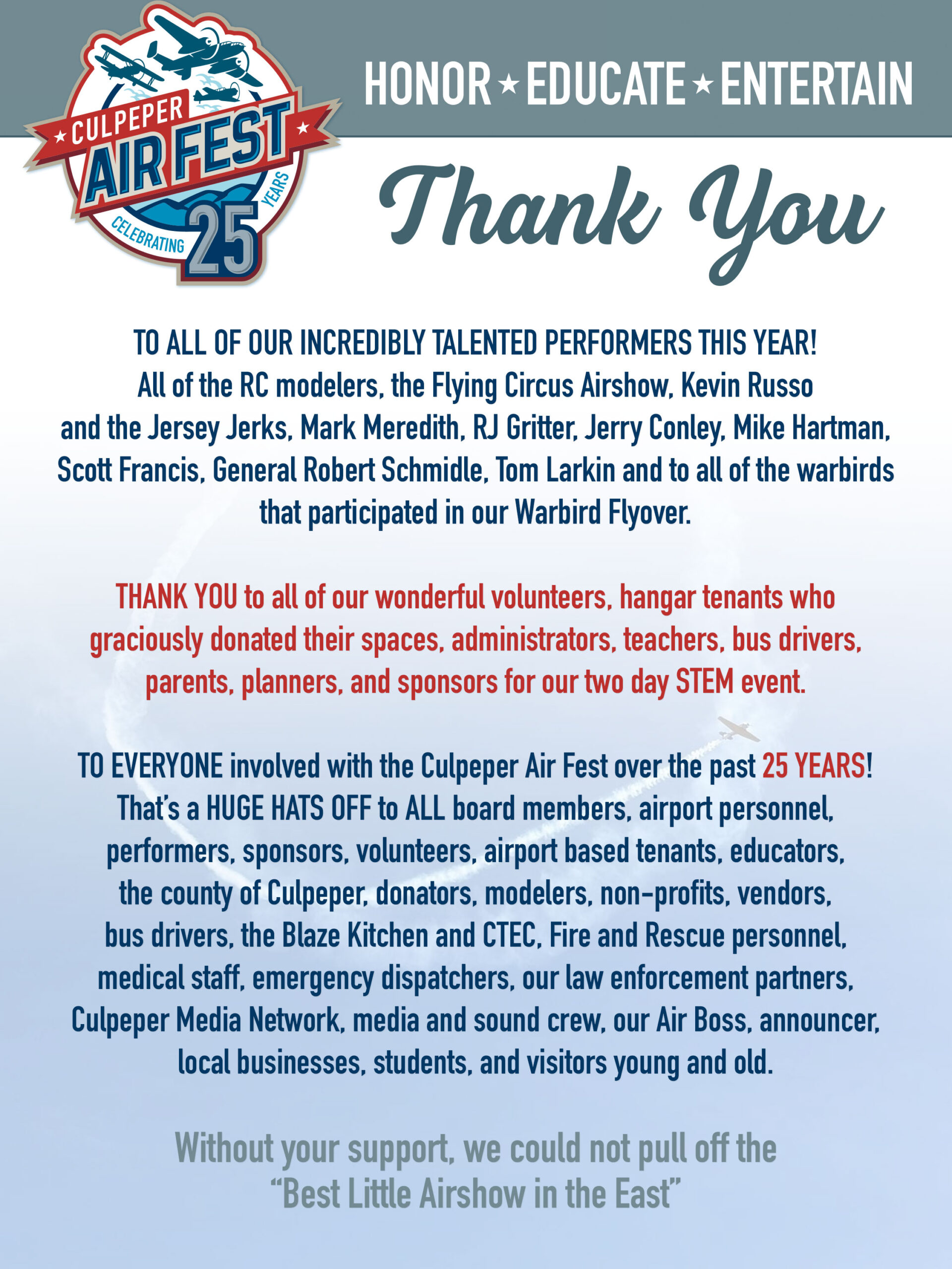 This is our 25th year of bringing you the best little airshow in the east! The 2025 Air Fest is in the planning stages. If you’d like to make a donation to this year’s show, you can do so via our website. As always we appreciate our community and fans for all of your incredible support over the years.